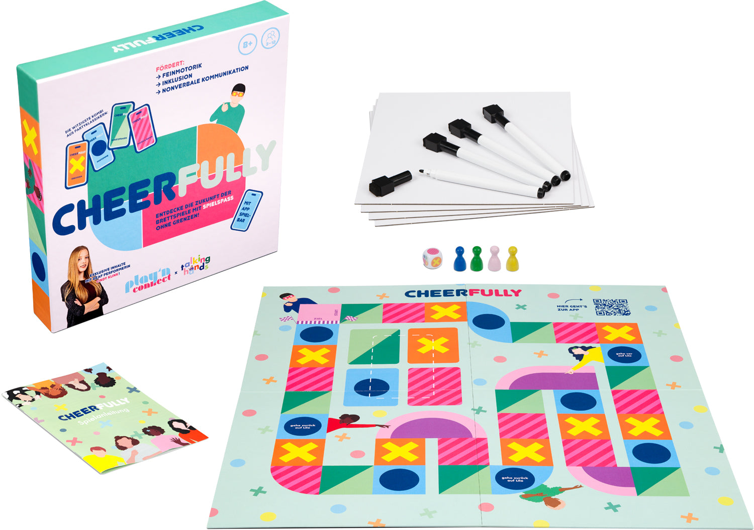 Hybrides Lernspiel: Cheerfully kombiniert physische Komponenten mit einer digitalen App, die das Spiel unterstützt. Das Smartphone dient zur Auswahl von Kategorien und Aufgaben – ein interaktives Konzept für moderne Brettspiele.